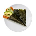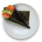 Fresh salmon, avocado, mayonnaise and roasted sesame grains wrapped in a nori cone with rice.