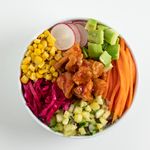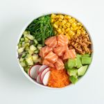 Rice, salmon, corn, avokado, pineapple salsa, goma wakame, massago orange, crispy shallots, red radish, spicy mayo