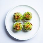 Avocado roll wrapped in seaweed leaf, covered with crispy panko pieces. Korean chili pepper paste with shrimp cocktail.