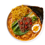 With beef, soy egg, vegetables, nori, ramen noodle and fried noodles in hot and spicy korean hot sauce.