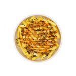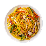 With shrimp, salmon, squid, soy egg, nori and vegetables, ramen noodle and fried noodles in hot and spicy korean hot sauce.