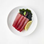 Thick sliced yellow fin tuna pieces with wakame seaweed and lemon.