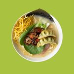 Gyoza with sauteed shiitake mushrooms and vegetables. With ramen noodles and fried noodles in miso juice. Pieces of chard, nori and spring onions on it